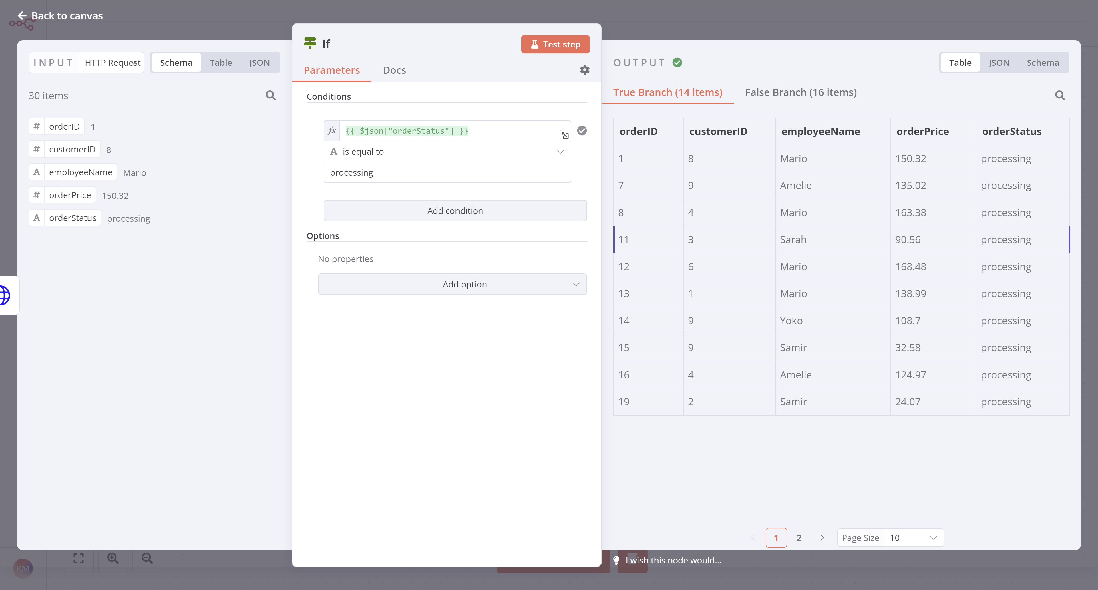 Nathan 🙋: This If node is really useful for filtering data! Now I have all the information about processing orders. I actually only need the employeeName and orderID, but I guess I can keep all the other fields just in case.